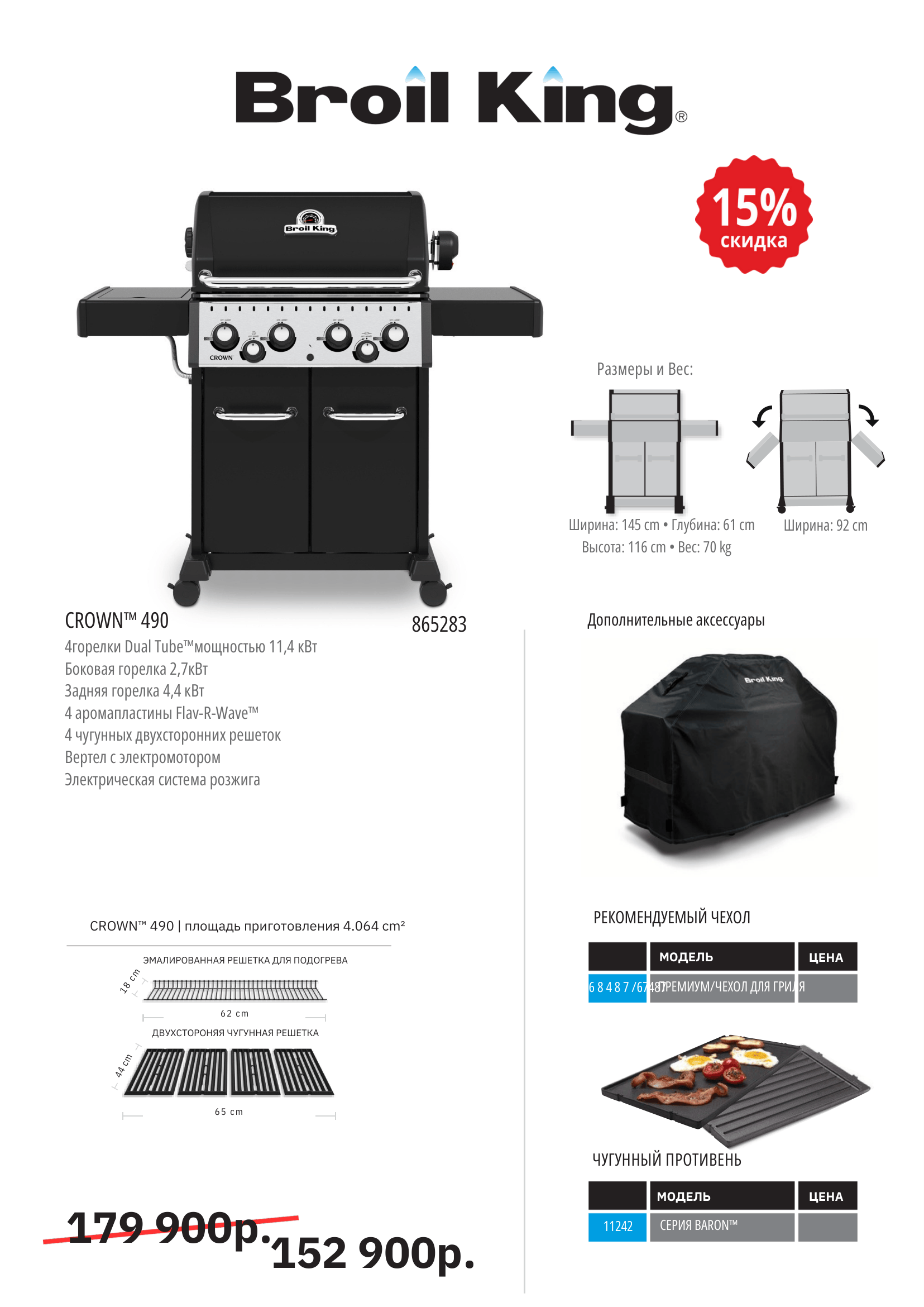 Гриль Crown Classic 490 разработан с вниманием к деталям и с использованием многих известных технологических решений Broil King, таких как аромапластины Flav-R-Wave™, электроподжиг Sure-Lite™ и точный термометр Deluxe Accu-Temp™.